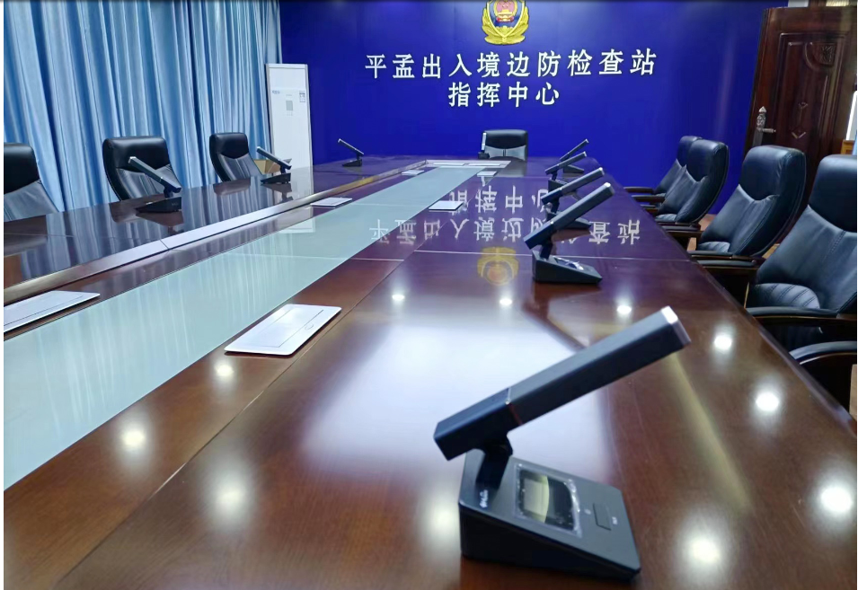 廣西平孟出入境邊防檢查站指揮中心采用HUAIN華音無線雙振膜會議系統(HY-U5880系列)搭配可視化管理系統、中央控制系統、擴聲系統等會議系統來推動智慧檢查站建設。