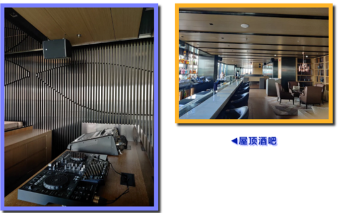 27樓屋頂酒吧Flair,分室內(nèi)室外兩部分,配置DJ打碟機(jī),主擴(kuò)聲由EV SM系列全頻同軸+15寸超低音組成,室外視野極佳,就坐于池水邊。身邊綠植叢中隱藏的EV 8寸蘑菇音箱同步播放室內(nèi)音樂(lè),品美酒賞夜景甚為愜意,開(kāi)業(yè)即成為高新區(qū)的一個(gè)新的網(wǎng)紅打卡地。