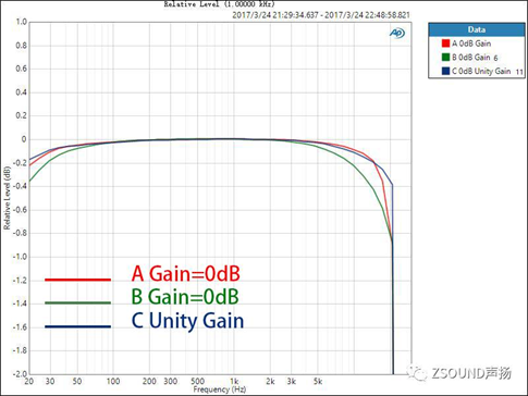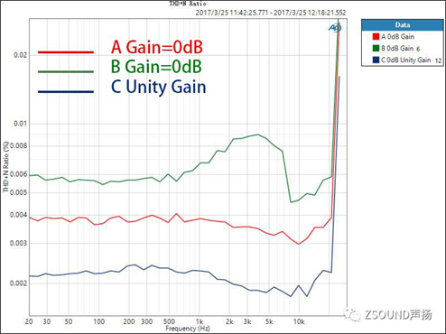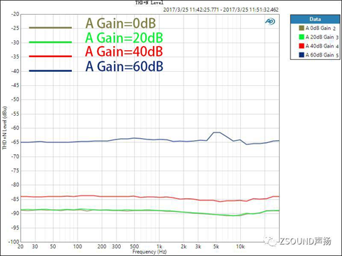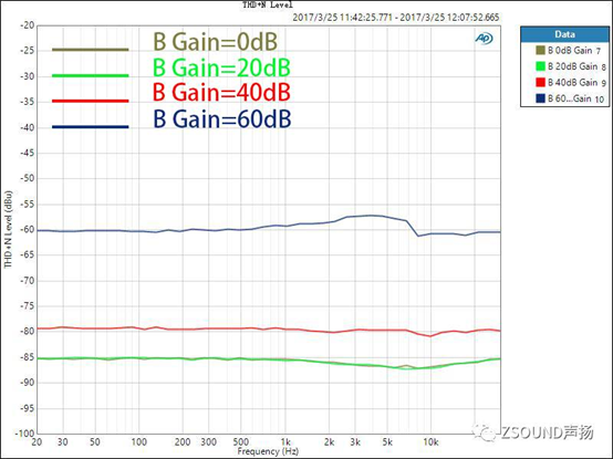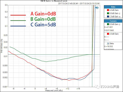 對于數(shù)字調(diào)音臺,我們不僅要關(guān)心話放增益在0dB時的THD+N比率,還需要了解到,話放增益在不同位置時的情況,因為這是使用中的實際情形。話放的增益在不同大小時,其引入的噪音和失真也是不同的,了解這一點對于用戶正確設(shè)置增益也很有參考意義。