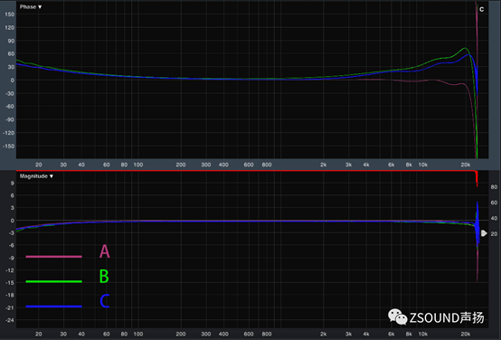 由圖可見三款產(chǎn)品的頻率響應(yīng)都能達到要求,幅頻響應(yīng)在±0.5dB之內(nèi),相頻響應(yīng)都在±30°之內(nèi),這其中還有一定的測量誤差。而三者之間的幅頻響應(yīng)差別還是顯而易見的,B型號的頻率響應(yīng)明顯比A和C差一些。
