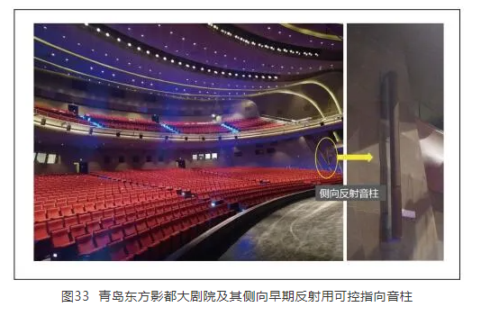 筆者作為本系統的主要設計實施人員之一,感覺系統中采用的同軸寬錐形覆蓋的揚聲器對于最終聽覺效果的提升起到了積極的推動作用,這種指向角度選型,進一步降低了揚聲器本身各單元間的相位響應問題,同時平滑了整個主動系統所提供的輔助聲能在廳堂內的均勻度。此外,側向反射聲采用電子可變指向音柱,其水平指向寬、垂直指向性窄的特點可在水平維度上實現更為廣泛的觀眾席覆蓋,而在垂直維度上實現更遠距離的觀眾席覆蓋,對于如此體量巨大的廳堂而言,這些特性都有效地提高了側向反射聲能的針對性和平順度。青島東方影都大劇院內部實景及其側向早期反射用可控指向音柱可見圖33。