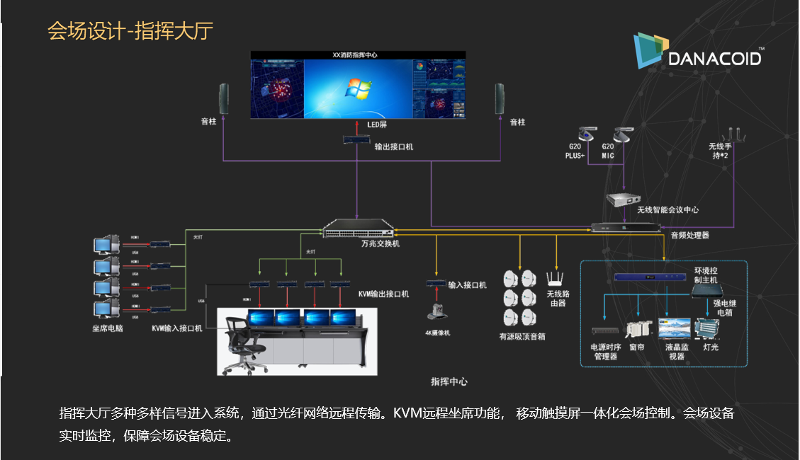 本項目旨在結(jié)合指揮中心工作特點,以指揮技術(shù)和信息技術(shù)為主導(dǎo),充分運用現(xiàn)代顯示技術(shù)、通訊技術(shù)、網(wǎng)絡(luò)技術(shù)等先進(jìn)技術(shù),對已有系統(tǒng)升級改造和功能擴充、改進(jìn),包括指揮中心的現(xiàn)有設(shè)備進(jìn)行擴容和升級,使系統(tǒng)能即適應(yīng)新技術(shù)的發(fā)展,又結(jié)合武漢消防指揮中心的需求、輔助決策平臺的需求:構(gòu)建以數(shù)據(jù)展示、可視化調(diào)度、領(lǐng)導(dǎo)會商決策、多媒體擴容、多媒體設(shè)備互聯(lián)互通及集中管理等于一體的現(xiàn)代化、網(wǎng)絡(luò)化、智能化指揮決策中樞。