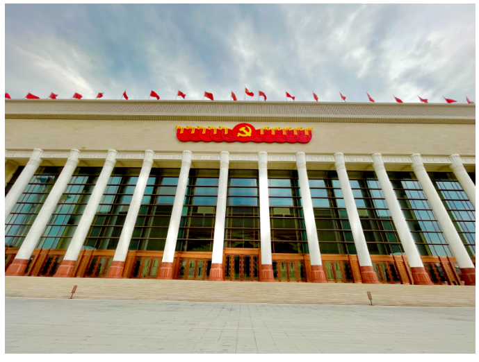 演出當晚,紅色大廳燈火通明,用紅旗元素搭建、黃色綬帶裝飾的舞臺與帷幔一起烘托出慶典氛圍,大廳頂部中央鑲嵌的五角星熠熠生輝。